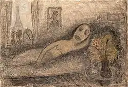 In 1947, after the end of the Second War and the liberation of Czechoslovakia, Diviš returned to his native country, more than two decades after he had first left for Paris.[2] Upon his return, he achieved a brief period of success. His written memoirs of Santé were published in a weekly paper, and in February 1948, his recent work was exhibited in Prague.[1] The same month, however, brought the Communist coup d'état which would marginalize artists of his type out of work.[2] He spent the rest of the decade producing illustrations for Karel Jaromír Erben's mid-19th century collection of ballads "Kytice", but only "Svatební košile" (Wedding Shirt) was published (in 1952).[1] He also produced a series of illustrations for short stories by Edgar Allan Poe.