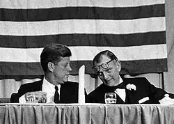 In 1963, Thomas was seriously considering not running for a fifteenth term. Local Democrats organized an appreciation dinner on November 21, 1963, with over 3200 attendees to persuade him to run for another term. The most visible attendees were President John F. Kennedy and Vice President Lyndon B. Johnson who both spoke of Thomas's leadership. Kennedy said, "Next month, when the United States of America fires the largest booster in the history of the world into space for the first time, giving us the lead, fires the largest, payroll -- payload -- into space, giving us the lead. " here the President paused a second and grinned. "It will be the largest payroll, too," he quipped. The crowd roared.[12] "And who should know that better than Houston. We put a little of it right in here." The President then resumed in a more serious vein, "But in any case, the United States next month will have a leadership in space which it wouldn't have without Albert Thomas. And so will this city."[13]