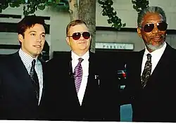 Left to right: Ben Affleck, Tom Clancy, and Morgan Freeman in 2002