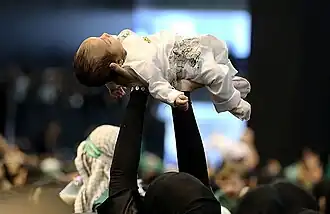 Shia Muslims commemorate the events of Karbala throughout the months of Muharram and Safar,[15] particularly during the first ten days of Muharram, culminating on the tenth (Ashura) with processions in major Shia cities.[16][17] The main component of these ritual ceremonies (maj'alis, sg. majlis) is the narration of the stories of Karbala,[18][16] intended to raise sympathy and move the audience to tears.[19] In the Shia commemoration of Karbala, Abd-Allah is represented as an innocent child who suffered unbearable thirst,[1] described as "the quintessence of symbol of the innocent victim."[20] His death carries perhaps the heaviest emotional weight for the Shia mourners,[21] and replicas of his empty cradle are often present in mourning processions.[1] Abd-Allah is also heavily featured in the verbal narratives of the ritual practices (rawza khani) and a complete majlis is sometimes dedicated to him.[1] As an act of commemoration, Iranian mourners often dress their baby boys in white jacket and green headband, which is how Abd-Allah is often represented in religious paintings.[22]