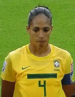 Aline Pellegrino (born July 6, 1982), commonly known as Aline, is a Brazilian former footballer who played as a defender for Russian club WFC Rossiyanka and several clubs in her native Brazil. She was a member of the Brazil national team that won the silver medal at the 2004 Summer Olympics[1] and competed at the 2007 FIFA Women's World Cup.[2] She was made captain of the national team in 2006.