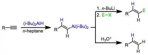 The use of silyl acetylenes avoids the problem of competitive metalation of terminal alkenes. The stereoselectivity of hydroalumination can be altered through a change in solvent: tertiary amine solvents provide the cis alkenylalane and hydrocarbon solvents provide the trans isomer.[14]