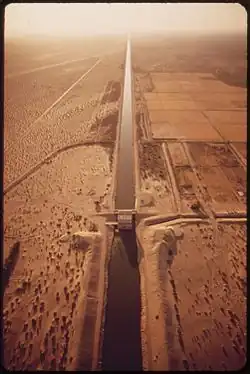 Approximately 68,000 acre-feet (84,000,000 m3) was lost annually by seepage from the All-American Canal, especially from the point where the canal crosses the great Algodones Dune Field. About 90% of this seepage entered Mexico.[9] At first this seepage caused widespread flooding, but Mexicali Valley residents and businesses built drainage and pumping systems to recover the seepage. Mexicali Valley agriculture became reliant upon this seepage for irrigation.[10] As water use increased in both rural and urban areas, this seepage became an issue of concern. The All-American Canal Lining Project, a part of California's Colorado River Water Use Plan, lined 37 kilometers (23 mi) of the canal to prevent seepage.[1] In 2006, a Mexicali business and civic organization and two California environmental non-profits challenged the lining project in US federal court on the basis that it violated the water rights of Mexican water users and violated US environmental statutes due to the seepage's effects on the nearby Andrade Mesa Wetlands. A rider in the Tax Relief and Health Care Act of 2006 required the completion of the lining project, however, and the lawsuit was rendered moot.[11] The Imperial Irrigation District built a parallel canal along the designated section of the original canal, and the water flow was rerouted into the new lined canal. Construction began in 2007 and was completed in 2009.[12]