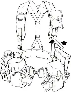 Suspenders, individual equipment belt – The individual equipment suspenders are Y-shaped with three adjusting straps, and four points of attachment to the individual equipment belt or small arms ammunition cases. The shoulder straps are padded with spacer cloth. Each shoulder strap has a web loop and a non-slip buckle on each of the straps in the front and one at the back through which the adjusting straps pass. There are rectangular metal rings located between the web loops and the buckles on the front of the straps. The 1-inch (2.5 cm) wide adjusting straps have snap hooks at one end. The back adjusting strap has an inverted V of which each end has a snap hook. Each of the adjusting straps has a loop around it made of 1-inch (2.5 cm) elastic material. In 1991, the individual equipment suspenders are redesignated LC-2 with no major modifications; minor modifications include the use of steel (instead of brass) for the four snap hooks and the two rectangular rings.