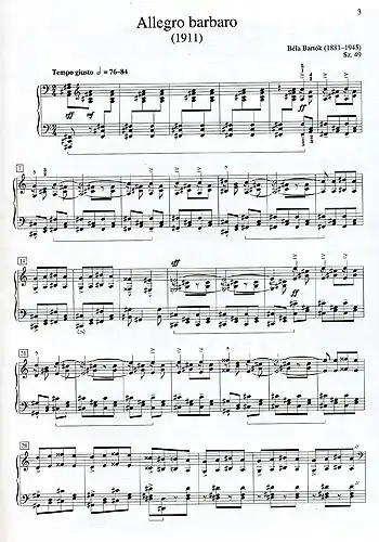 Allegro barbaro, BB 63 (Sz. 49), composed in 1911, is one of Béla Bartók's most famous and frequently performed solo piano pieces. The composition is typical of Bartók's style, utilizing folk elements. The work combines Hungarian and Romanian scales; Hungarian peasant music is based on the pentatonic scale, while Romanian music is largely chromatic. The title is a jab at Bartók's critics who called him a 'barbarian'.[1]
