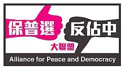 The Alliance for Peace and Democracy (Chinese: 保普選保和平大聯盟; lit. 'The Protect-Universal Suffrage and Protect-Peace Alliance',[4] formerly 保普選反佔中大聯盟, literally: "The Protect-Universal Suffrage and Anti-Occupy Central Alliance") is a pro-Beijing[5][6] political group based in Hong Kong.[7] It was founded on 3 July 2014 by members of the pro-Beijing alliance including 40 pro-Beijing groups and scholars,[6] many of whom are also members of the pro-Beijing group Silent Majority for Hong Kong, and was backed by the pro-Beijing Parties Democratic Alliance for the Betterment and Progress of Hong Kong, The Hong Kong Federation of Trade Unions and The New People's Party.[8]