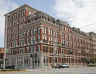 Seven stories tall,[2]: 8 it is a brick building with a stone foundation and a slate roof.[3] Major architectural elements include an ornate cornice with heavy bracketing and its Mansard roof that is pierced by many dormers.[4]