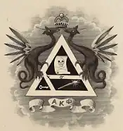 There are two different descriptions of the Alpha Kappa Psi badge. One describes the badge as "an equilateral triangle bearing in the angles of the Greek letters".[2] The other describes it as "a triangle divided into three panels, one displaying a scroll carrying a skull and bones, one a key and the third a torch".[3][4]