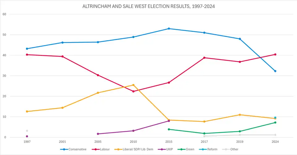 From 2001 to 2010, it was the only Conservative seat in Greater Manchester; its predecessor seats were always Conservative. In 1997, local grammar school–educated Brady was elected on a small majority of 1,500. His majority peaked at over 13,000 in 2015, being reduced in 2017 to just under 7,000. In 2019, it fell further to 6,139, a swing of 0.5% from Conservative to Labour, bucking the trend of large swings in the opposite direction. At the 2024 election, Connor Rand was elected on a swing of 9.7% as the first ever Labour MP for this seat or its predecessors (Altrincham and Sale, and Altrincham).