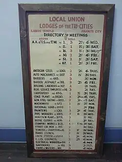 This sign was at the ground floor entrance to the Labor Temple in Granite City, IL. Note the AAIST Lodge Numbers at the top. These were all located at Granite City Steel. Electrical Workers 68 was also at that plant. In 1936 all those units joined SWOC and subsequently in 1942 they became part of the Steelworkers.Lodges 16, 30 and 67 existed until 2003 when they were part of a merger that included the O&T local 9325 and the Security local 4063 to create a new local 1899 (because evidence existed of a union since at least that year.) They are arguably the oldest continuously existing steel local unions in the USA.