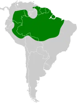The Amazonian antshrike is found throughout the Amazon Basin. The subspecies are distributed thus:[7][8][9][10][11][12]