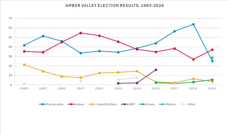 The constituency's generally small majorities and bellwether status since 1983 (being won by the party that nationally holds the most parliamentary seats) means Amber Valley was, by most common measures, a marginal seat, with a reputation for political volatility, with periodic large swings towards both the Conservative and Labour parties.
