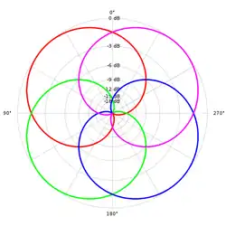 Being omnidirectional, the channel always gets the same constant input signal, regardless of the angles. So that it has more-or-less the same average energy as the other channels, W is attenuated by about 3 dB (precisely, divided by the square root of two).[3] The terms for actually produce the polar patterns of figure-of-eight microphones (see illustration on the right, second row). We take their value at and , and multiply the result with the input signal. The result is that the input ends up in all components exactly as loud as the corresponding microphone would have picked it up.