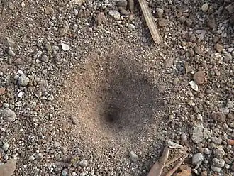 Trapdoor spiders excavate a burrow and seal the entrance with a web trapdoor hinged on one side with silk. The best-known is the thick, bevelled "cork" type, which neatly fits the burrow's opening. The other is the "wafer" type; it is a basic sheet of silk and earth. The door's upper side is often effectively camouflaged with local materials such as pebbles and sticks. The spider spins silk fishing lines, or trip wires, that radiate out of the burrow entrance. When the spider is using the trap to capture prey, its chelicerae (protruding mouthparts) hold the door shut on the end furthest from the hinge. Prey make the silk vibrate, and alert the spider to open the door and ambush the prey.[7][8]