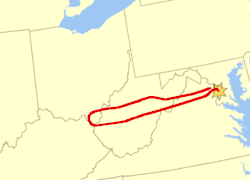 While Flight 77 was 5 miles (8.0 km) west-southwest of the Pentagon in Arlington County, Virginia, it made a 330-degree spiral turn clockwise. By the end of the revolution, the 757 was descending 2,200 feet (670 m), pointed toward the Pentagon and downtown Washington. Advancing the throttles to full power, Hanjour rapidly began diving toward his target.[63] The wings clipped five street lights as the plane flew level above the ground, while the right wing in particular struck a portable generator, creating a smoke trail seconds before smashing into the Pentagon.[64][65]