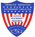 AFGE's original emblem was a shield with the stars and stripes and the words "Justice, Fraternity, Progress" and the current emblem is three workers supporting a globe with a map of the United States and the words "Proud to Make America Work".