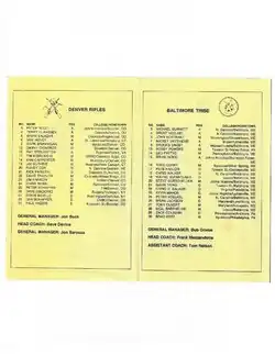 The League announced a 6-team league with each team playing 15 games. Teams were set in Boston, Baltimore, Syracuse, New Jersey, Long Island, and Denver. The league attracted some of the greatest lacrosse players of the era including USA World team members and US Lacrosse Hall of Fame inductees such as Brook Sweet (University of Massachusetts), Brad Kotz (Syracuse University), Brian Wood (Johns Hopkins University), Bill Bergan (Hobart College), Tim Schurr (Washington & Lee University), Peter Scott (Johns Hopkins), Steve Beville (Washington College), Gerry Byrne (University of Massachusetts), Zack Colburn (UPenn), Todd Curry (Syracuse University), Michael Burnett (UNC), John Nostrant (Washington College), Kevin Martin (Hobart College), Dan Pratt (Syracuse University), Mark Burnham (Syracuse University), Travis Solomon (Syracuse University), Greg Tarbell (Syracuse University) and Tom Rosa (Hobart College) to name just some of the 138 players drafted and signed by the league (80% of the players were All-Americans in college). Baltimore attackman, US Lacrosse Hall of Fame inductee Brooks Sweet[10] stated "Every game is going to be like Hopkins vs. Hopkins. I was skeptical at first, but when I saw the caliber of players in the league, I was impressed."[11] [[