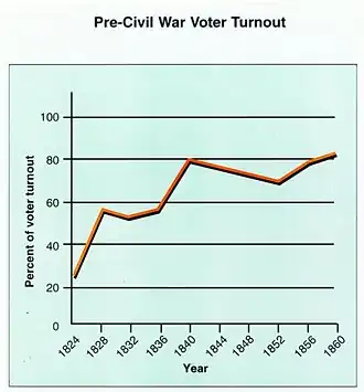 In the 1820s every government office was elected, or chosen by elected officials. After 1848 many states revised their constitutions so that judges were elected to fixed terms, and had to campaign before the voters like everyone else. Unlike other countries, many different offices were elected, with election days staggered so there was little respite from constant campaigning. As the politicians discovered more potential blocs of voters, they worked to abolish the traditional property standards for suffrage. The principles of republicanism seemed to require that everyone be eligible, and indeed actually vote. Several states allowed immigrants to vote before they took out citizenship papers; elsewhere the parties facilitated the naturalization process. By mid-century, practically every adult white male was a potential voter—or indeed, an actual voter, as turnout nationwide reached 81 percent in 1860. America stood in stark contrast with Europe, where the middle classes, peasants and industrial workers had to mobilize to demand suffrage. Late in the century, Americans did create farmer and labor movements, but most were nonpartisan, and those that fielded candidates rarely lasted more than an election or two.[29]