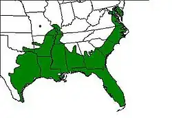 The American green tree frog is found in the central and southeastern United States with a geographic range from the Eastern Shore of Maryland to southeast Florida with populations as far west as central Texas and as far north as Delaware and southern New Jersey, though the size of its distribution may be larger or vary seasonally. They are indigenous to the coastal plains of North Carolina, South Carolina, Georgia, and all of Florida.[16] The American green tree frog is considered monotypic, but clinal variation has been observed from Florida north along the Atlantic coastal plain. This may be attributed to the result of strong selection and/or drift.[5]