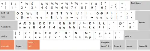 - The Alt key to the right of the space bar is replaced by an AltGr key