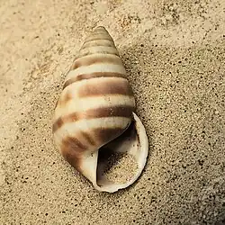 The shell ranges from medium to large in size. It exhibits chirality dimorphism, and presents an elongate conical shape that is rather thick and glossy. The spire varies from elongate conical to ovate conical. The apex appears acute, lacking a black spot on its tip, and the earlier whorls show a whitish to tinted pink coloration. Comprising six to seven convex to smooth whorls, the shell displays a wide and shallow suture, and the body whorl is well rounded. The periostracum is thin and corneous; a varix is usually absent. The shell's ground color varies from whitish and yellowish to reddish brown; the banding pattern is variable, ranging from non-banded (monochrome color) to featuring narrow to wide multiple reddish-brown spiral bands on a whitish or yellowish ground color. The parietal callus is slightly thickened and either whitish or transparent. The aperture is ovate; the peristome is expanded but not reflected. The outer lip appears whitish. The columella is straight and can be either thick or thin. The umbilicus is imperforate.