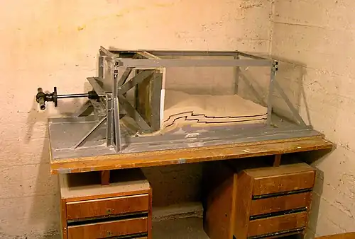 The first analogue model was built by James Hall for simulating folds. He used a lateral compression machine for the simulation, and this machine is still shown in the Royal Society of Edinburgh.[2] The final result from the model is quite close to observation of the Berwickshire coast.[2] Although the model he used is simpler than current ones, the idea remains in use.