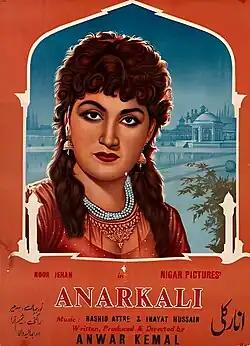 Anarkali is a 1958 Pakistani historical drama film, directed by Anwar Kamal Pasha and starring Noor Jehan and Sudhir in lead roles. Based on the Urdu play of the same name by Imtiaz Ali Taj, the screenplay is written by Qamar Ajnalvi. The film revolves around the love of Jahangir for a slave girl, Anarkali, which creates a serious conflict between Prince Jahangir and his father, Mughal emperor Akbar. The film was released on 4 June 1958, and its performance was 'average' at the box office.