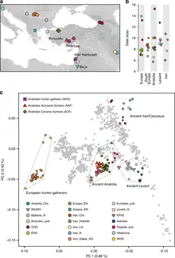 - ^ Feldman, Michal; Fernández-Domínguez, Eva; Reynolds, Luke; Baird, Douglas; Pearson, Jessica; Hershkovitz, Israel; May, Hila; Goring-Morris, Nigel; Benz, Marion; Gresky, Julia; Bianco, Raffaela A.; Fairbairn, Andrew; Mustafaoğlu, Gökhan; Stockhammer, Philipp W.; Posth, Cosimo (31 March 2019). "Late Pleistocene human genome suggests a local origin for the first farmers of central Anatolia". Nature Communications. 10 (1): 1218. Bibcode:2019NatCo..10.1218F. doi:10.1038/s41467-019-09209-7. ISSN 2041-1723. PMC 6425003. PMID 30890703.