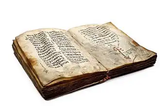 The Anbandidi Gospel (Georgian: ანბანდიდი სახარება, romanized: anbandidi sakhareba) consists of four Gospels and dates back to the 9th century. They are currently housed in the National Archives of Georgia, fond #1446, manuscript #107. They have 192 pages, are made of parchment. The dimensions are: 317x237; Asomtavruli; ink – brown, embellished initials – in certain cases with cinnabar. The text is rewritten in some parts; the manuscript is entirely written in Asomtavruli, in two columns; upper borders are cut and the traces of upper quire pagination are lost; ruling lines and dots are very visible.