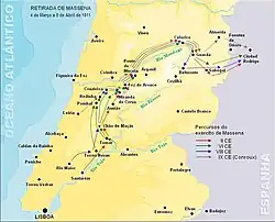 After waiting until the harvest period to allow his troops to resupply,[107] Masséna succeeded in seizing Ciudad Rodrigo on 10 July and then Almeida on 27 August, before entering Portugal in September.[90] Faced with his opponent's advance, Wellington quickly retreated towards Lisbon, making sure to destroy the crops before the French arrived. The British general finally established himself in front of Coimbra with the intention of halting Masséna and, entrenched on a height, repelled the marshal's assaults at the Battle of Bussaco on 27 September 1810.[108] Masséna, noting the futility of attacking the solid British infantry head-on, organized a manoeuvre which allowed him to outflank the enemy defences and resume his march towards Lisbon, while Wellington managed to retreat with his army intact.[109]