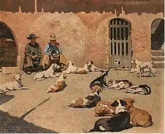 Andrés Parladé y Heredia, after 1903, the third Count of Aguiar (1 June 1859, Málaga - 4 April 1933, Seville) was a Spanish genre and portrait painter who is best remembered for his hunting-related scenes, many of which feature dogs.