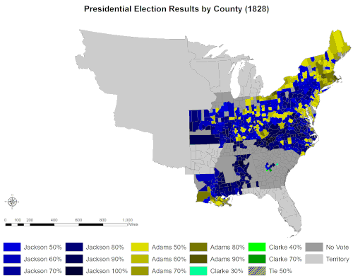 The Tariff of 1828, also known as the Tariff of Abominations, had been signed into law earlier in the year, increasing tariff rates to above 60%. Though it had narrowly passed in the House, it was unpopular with the Southern states as they imported materials and goods from abroad.[8] Jackson and the Democrats opposed the tariff, and the unpopularity of the bill led to a division of the vote into two main sections: the Northern, minority Adams vote, and the Southern, majority Jackson vote. Jackson also personally appealed to the Western states, and he carried their electoral votes as well.