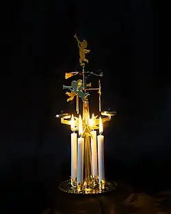 Angel chimes, also known as angel-abra, are a form of Christmas decoration popular in Europe and North America.[1] They apparently have the same origins as the Christmas pyramid, which functions on the same principle. They differ from these, primarily, in being mass-produced from metal and might have bell-ringing angels, whereas Christmas pyramids are usually crafted from wood and do not necessarily have bells.