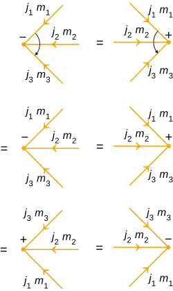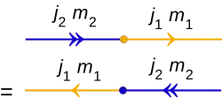 The notation parallels the idea of Penrose graphical notation and Feynman diagrams. The diagrams consist of arrows and vertices with quantum numbers as labels, hence the alternative term "graphs". The sense of each arrow is related to Hermitian conjugation, which roughly corresponds to time reversal of the angular momentum states (cf. Schrödinger equation). The diagrammatic notation is a considerably large topic in its own right with a number of specialized features – this article introduces the very basics.