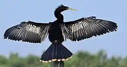 Unlike many other waterbirds such as ducks or pelicans, anhingas do not cover their feathers in an oily excretion which allows them to soak up waters. With their plumage soaking up waters, anhingas decrease buoyancy while diving for prey, giving them an advantage while foraging. However as a downside these birds are prone to heat loss and restricts their modern range to subtropical and tropical environments. To counteract the heat loss, darters are known to strike a characteristic pose while perching, sunning themselves with widely extended wingtips. It is possible that, in addition to this behavior, large extinct anhingas such as A. pannonica specifically grew to their respective sizes to counteract heat loss, as an increase in volume in relation to surface area is generally favorable for retaining heat. This matches the fact that Anhinga pannonica is known from warm environments such as the Kenyan Ngorora Formation and the Hammerschmiede locality in Germany, which is thought to have been a warm, suptropical fluvial environment with a mean annual temperature of over 20 °C. Consequently, Anhinga pannonica disappeared from Europe as temperatures gradually sank towards the end of the Miocene, becoming too cold to support its great size and sensitivity to heat loss. Its extinction in Africa, as well as the demise of the giant Neotropic anhingas however remain unclear.[4]
