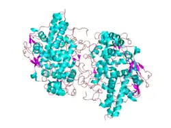 1. ^ a b c PDB: 1dnu​; Blair-Johnson M, Fiedler T, Fenna R (November 2001). "Human myeloperoxidase: structure of a cyanide complex and its interaction with bromide and thiocyanate substrates at 1.9 A resolution". Biochemistry. 40 (46): 13990–7. doi:10.1021/bi0111808. PMID 11705390.