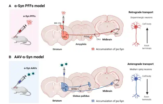 In contrast to the PFF model, the α-synuclein inclusions are nuclear and demonstrates an anterograde transport in which the pα-syn travels from the soma of the neuron to the terminals, where expression are maintained within medium spiny neurons.[13]