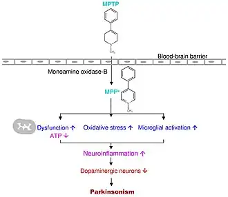 1-Methyl-4-phenyl-1,2,3,6-tetrahydropyridine (MPTP) is a widely used neurotoxin in Parkinson's disease research (Figure 4). In contrast to 6-OHDA, MPTP crosses the BBB which making the neurotoxin even more selective for dopaminergic neurons. Due to the ability to cross the blood-brain-barrier, MPTP is administered peripherally, subcutaneously. This neurotoxin is known to replicate oxidative stress, ROS, energy failure, and inflammation; which are all hallmarks in Parkinson's disease. However, it does not produce Lewy body pathology. The mechanism of action of MPTP is due to its conversion to 1-methyl-4-phenylpyridinium (MPP+) caused by the interaction of MPTP with monoamine oxidase B (MAO-B). (Figure5). MPTP enters astrocytes and is metabolized to MPP+ before being released. Once released into the extracellular space, MPP+ is taken up into the neuron by DAT and is stored in vesicles by the up take of vesicular monoamine transporter (VMAT2). In the neuron, MPP+ inhibits the function of complex 1 of electron transport chain, which decreases ATP production and releases ROS.