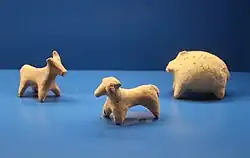 Figurines of domestic animals from tombs at Kish (Mesopotamia), dated to around 2500–2300 BC: from left to right, a cow, a ram, and a pig. Ashmolean Museum.