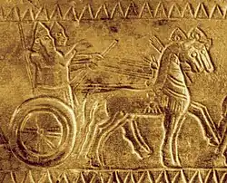 Urartian king Sarduri II on a light chariot drawn by two horses, detail of a bronze helmet, 7th century BC.