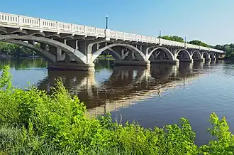 The Anoka–Champlin Mississippi River Bridge, also known as the Ferry Street Bridge, is a 10-span open spandrel concrete deck arch bridge that spans the Mississippi River between Anoka and Champlin, Minnesota, United States. It was built in 1929 by the Minneapolis Bridge Company, replacing an 1884 bridge at the same site.[1]