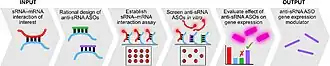 Antisense small RNA can also be engineered and utilized by scientists to perform experimental functions.[20] In synthetic biology, employing non-coding RNA such as antisense small RNA has advantages for creating regulatory architecture within engineering systems, provided the ability to predict function using the strand sequence.[20] In experiments, engineered riboregulators, which are specific RNA that respond to signal RNA through complementary base pairing utilizing anti-small RNA, have been found to be capable of activating independent gene expression.[20] Development of RNA array-based interaction assays that allow for screening in vitro have further advanced platforms targeting gene expression with antisense small RNAs.[19][21] RNA-array based interaction assays screen for synthetic antisense small RNA interactions in vitro, through a surface-capture technique.[19][21] An array of immobilized double-stranded DNA template for antisense small RNA sits opposite to an RNA-capture surface composed of possible antisense small RNA targets, separated by a solution of transcription reagents.[19][21] Captured RNA are visualized using fluorescent staining, which can indicate whether a prospective antisense small RNA has been bound to its target.[19][21]