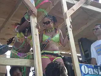 Antigua's carnival has multiple parades and costumed events called mas', short for masquerade.[13][14][15] Historically, mas' in the Caribbean involved paraders dressed up in big, elaborate costumes depicting real-life figures of the past in order to tell stories of the past.[16][17] Today there are many different types of mas' during the Carnival of Antigua and other Caribbean islands.[16][17][18][19] Participating in the costumed parades is known as "playing mas'."[20][21]
