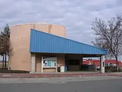 A small shelter building was added in December 1990, with an asymmetric teal-colored metal roof supported by concrete pillars. The building was a partially open-sided pavilion with sheltered concrete benches for travelers.[5] The station building included a ticket booth for passenger assistance,[6] but Amtrak's timetables never listed the station as staffed.[7]