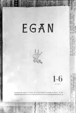 As some pre-war Basque cultural institutions were getting re-established in the Francoist Spain, Arrúe was increasingly engaged in their activities. In 1953 he assumed co-directorship[100] of Egan,[101] a review issued by Real Academia Vascongada de Amigos del País. It is in Egan that in 1954 he started to publish[102] a regular column[103] dedicated to cuisine[104] and maintained for over 20 years.[105] The same year he commemorated fellow Carlist vascologist Julio Urquijo Ibarra by facilitating foundation of a Basque philology institute bearing his name.[106] When Euskaltzaindia, the Basque language academy, managed to regain its precarious legal standing in the early 1950s, Arrúe neared the institution, to join it formally in 1954.[107] As a lawyer and a politician he was instrumental in organizing its first congress in Aránzazu in 1956,[108] overcoming a number of legal, administrative and political obstacles.[109] He also presided over many of its sessions[110] and was key to engineering the follow-up, vital to the re-launching of Euskaltzaindia after the Civil War.[111]