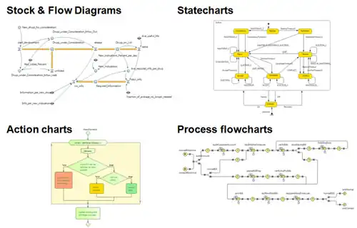 • Statecharts are used mostly in Agent Based modeling to define agent behavior. They are also often used in Discrete Event modeling, e.g. to simulate machine failure. [49][50]