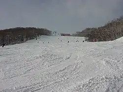 The ski resort expands on two mountains, Mt. Maemori and Mt. Nishimori, with 21 trails, and a total trail length of 45.1 kilometres (28 mi) for skiers and snowboarders of all levels.[9] It is the largest ski resort operated by a single company in Japan, with an average run of 2.1 km (1.3 mi), Japan’s longest average.[3][9][39] The maximum slope is 34° on the Second Sailer Run A; the longest run is 5.5 km (3.4 mi) and the vertical drop is 828 m (2,717 ft).[40] Lift service includes 2 gondolas and 14 chair lifts including 3 high-speed quad lifts and 11 double chairlifts.[41] The resort is also family-friendly, with a kid's ski area, child care service, snow play areas, and a petting zoo.[42] The winter ski season in Appi stretches over 5 months from December to early May. Nighttime skiing is available most nights; skiing and snowboarding lesson programs are available.[43] CNN International ranked Appi Kogen the best ski resort in Asia.[2]