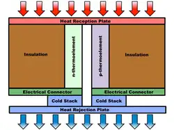 Near the Sun, solar cell performance deteriorates from high incident particle flux and high temperatures from heat flux.[8] However, thermoelectric energy conversion systems that use thermoelectric materials (e.g. SiGe alloys) as a supplemental source of power for missions near the Sun can operate unprotected in vacuum and air environments under high temperatures due to their low sensitivity to radiation damage.[8] Such properties have made SiGe thermoelectrics convenient for power generation in space. The multifoil cold stack assembly, composed of molybdenum, tungsten, stainless steel, copper, and alumina materials, provides the insulation between the electrical and thermal currents of the system. The SiGe n-leg doped with boron and SiGe p-leg doped with phosphorus act as the intermediary between the heat source and electrical assembly.