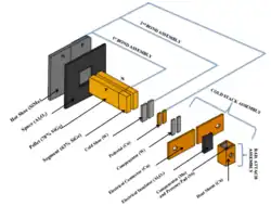 The thermocouples/unicouples attached to the outer shell consist of a SiGe alloy n-leg doped with boron and a SiGe p-leg doped with phosphorus to provide thermoelectric polarity to the couple.[6][11] The electrical and thermal currents of the system are separated by bonding the SiGe alloy thermocouple to a multifoil cold stack assembly of molybdenum, tungsten, stainless steel, copper, and alumina components.[11] Several layers of Astroquartz silica fiber yarn electrically insulate the legs of the SiGe thermocouples. In between the inner insulation system and the outer shell, copper connectors form the electrical circuit, which uses a two-string, series-parallel wiring design to connect the unicouples. The circuit loop arrangement minimizes the net magnetic field of the generator.[11]