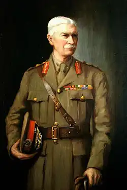 In September 1914, just a few weeks after the British entry into World War I, Paris was promoted to the temporary rank of brigadier general and placed in command of the Royal Marine Brigade.[13] Shortly afterwards, however, he was promoted to the temporary major general in October and took command of the Royal Naval Division[14] from its concentration in Antwerp and he was seen to have preserved the particular identity and character of the division while it fought alongside the British Army. He was promoted from colonel second commandant to substantive major general, in recognition of his services in the field, on 16 October 1915,[15] and was "noted for distinguished service in command of the Royal Naval Division" in November.[16] He was appointed a Knight Commander of the Order of the Bath (KCB) in the 1916 New Year Honours. While in Belgium on 20 June 1917, he was wounded in the shoulder, the back and he lost his left leg and consequently had to relinquish his command. He retired from the military on account of his wounds in June 1917.[17]